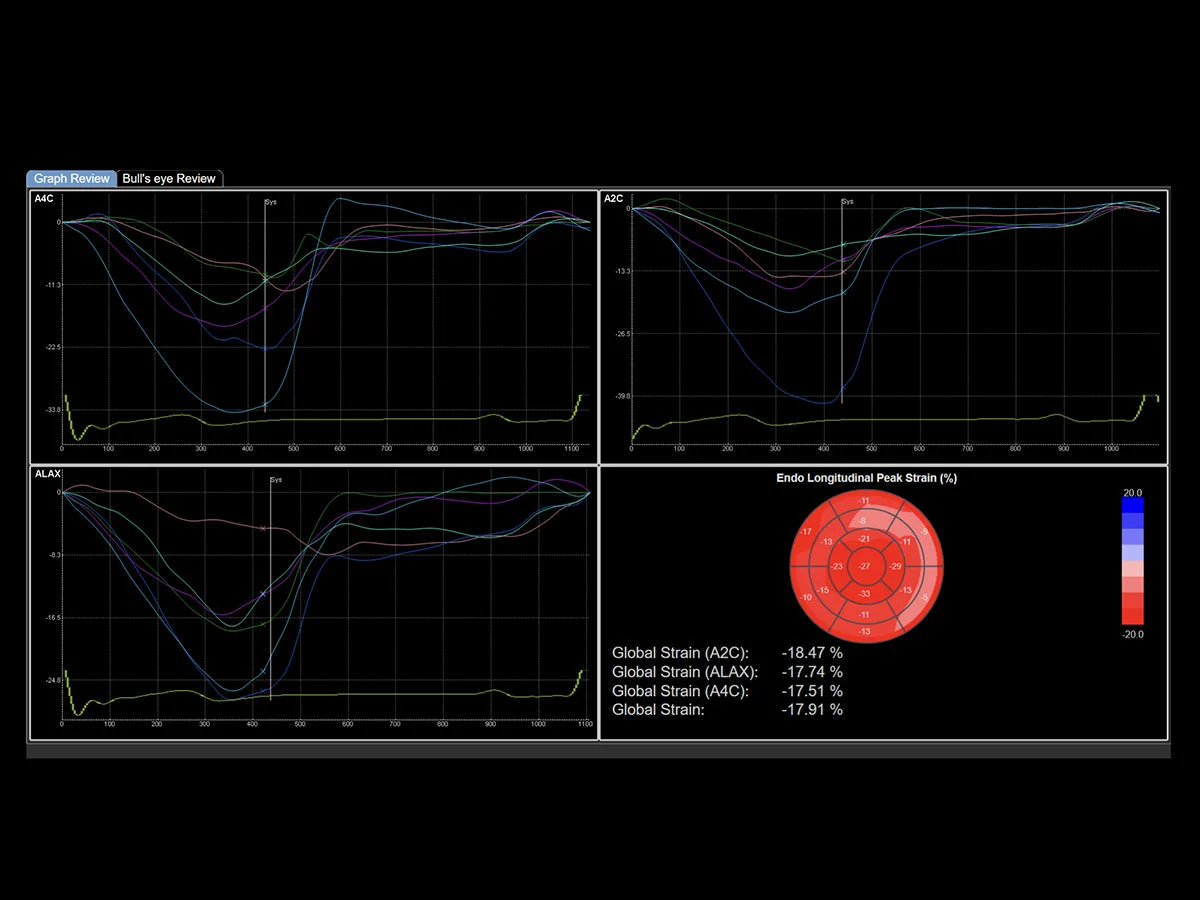 Esaote’s XStrain™ technology offers cutting-edge myocardial deformation analysis across multiple cardiac chambers and views—including the left ventricle (LV), right ventricle (RV), left atrium (LA), and short-axis (SAX) planes. Utilizing speckle-tracking algorithms, XStrain™ provides a detailed evaluation of the global and segmental strain, enabling early detection of subtle systolic dysfunction that is often missed by traditional metrics.