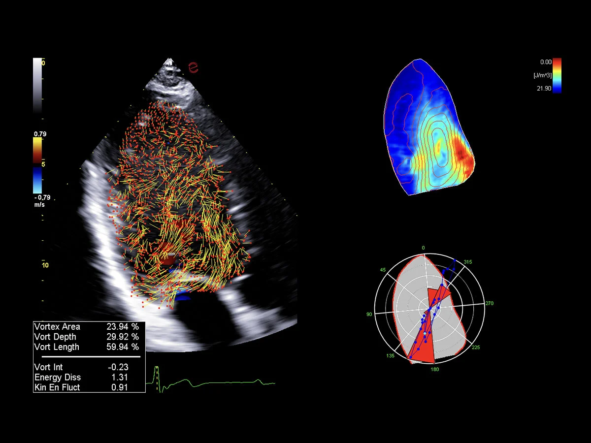 Esaote’s HyperDoppler technology provides an advanced visualization of intracardiac blood flow dynamics, offering clinicians an intuitive understanding of complex hemodynamics that goes beyond conventional Doppler imaging. By generating real-time vector maps, streamlines, and vortex formations, HyperDoppler enables the detailed assessment of diastolic function, ventricular dyssynchrony, and valvular abnormalities.
